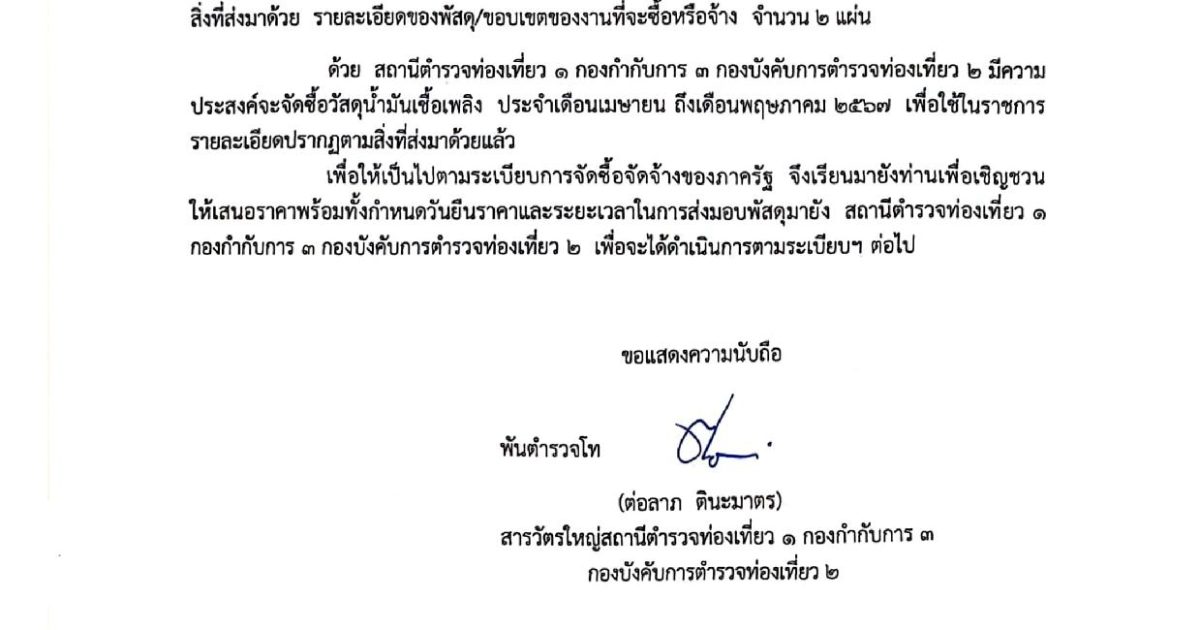 เชิญชวนเสนอราคา สำหรับจัดซื้อวัสดุน้ำมันเชื้อเพลง รถเอทีวี เม.ย.-พ.ค.67