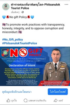 จัดทำอินโฟกราฟฟิก No gift policy เพื่อประกาศเจตนารมณ์ผ่านช่องทางสื่อสังคมออนไลน์ เพจ Facebook ตำรวจท่องเที่ยวพิษณุโลก