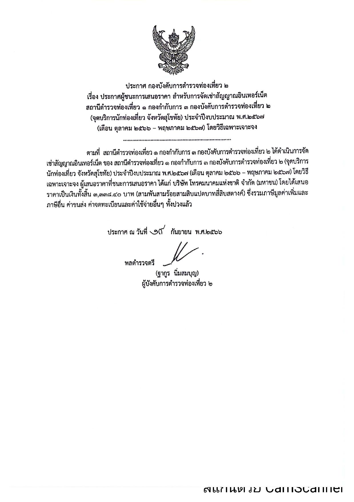 ประกาศผู้ชนะการเสนอราคา สำหรับการจัดเช่าสัญญาณอินเทอร์เน็ต ส.ทท.1 กก.3 บก.ทท.2 (จุดบริการนักท่องเที่ยว จว.สุโขทัย) ประจำปีงบประมาณ พ.ศ.2567 (เดือน ต.ค.66-พ.ค.67) โดยวิธีเฉพาะเจาะจง 19 กันยายน 2566 โดย admin